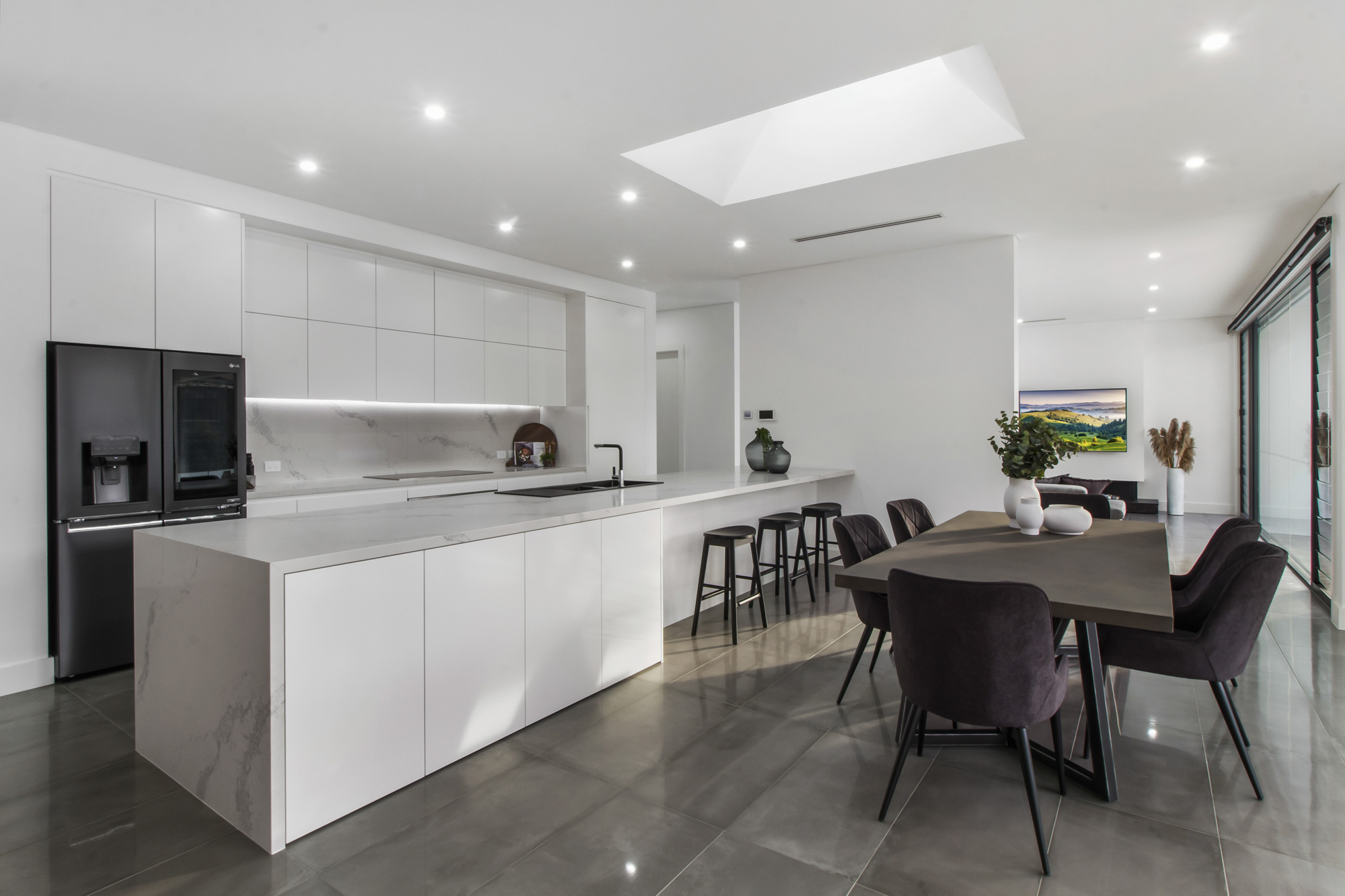 In this project, our discerning team embraced open design principles to create an integrated living and kitchen area that’s complemented by a modern alfresco area, seamlessly extending to a beautiful landscaped backyard. The home’s striking appeal doesn’t stop at its looming facade - internally, every choice of material and finish speaks to quality, timelessness, and ease of movement.